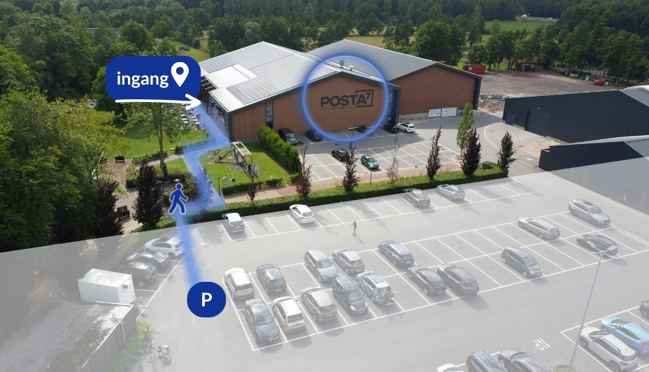 Je ziet Posta7 op de gevel vanaf de parkeerplaats